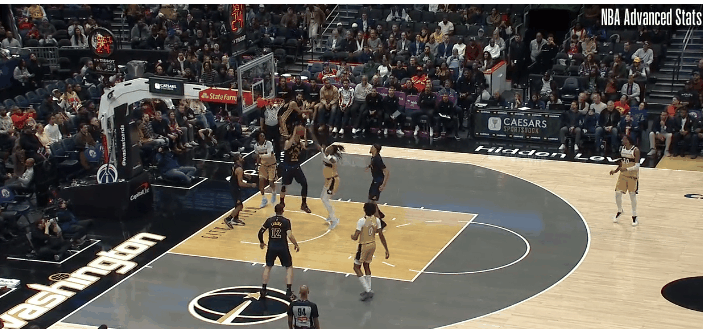 換個(gè)人也如此:圖4盧卡突破,薩爾橫移攔擋,盧卡高拋,順下的海耶斯空接。