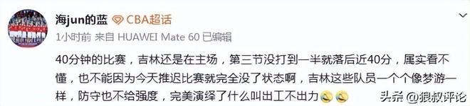 媒體人“海jun的藍”發(fā)文點評:40分鐘的比賽,吉林還是在主場,第三節(jié)沒打到一半就落后近40分,屬實看不懂,也不能因為今天推遲比賽就完全沒了狀態(tài)啊,吉林這些隊員一個個像夢游一樣,防守也不給強度,完美演繹了什么叫出工不出力。