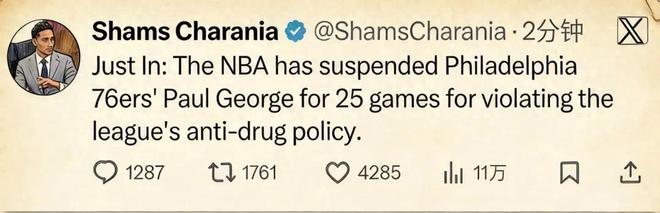 北京時間2月1日,就在聯(lián)盟各支球隊都在緊鑼密鼓地展開引援操作的時候,名記Shams突然報道:費城76人前鋒喬治因為違反聯(lián)盟禁藥政策,被聯(lián)盟處以禁賽25場的處罰。