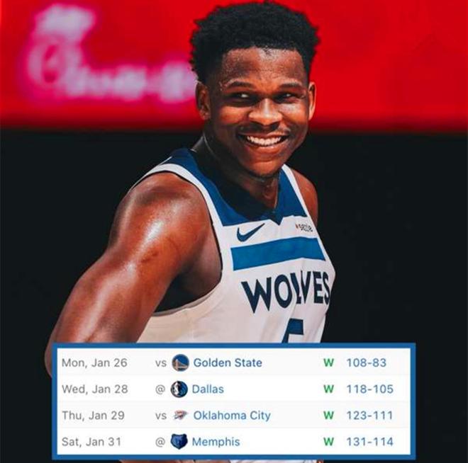 賽后森林狼官方發(fā)文到:“我們拿到了西部目前現(xiàn)存最長(zhǎng)的連勝—4連勝。”