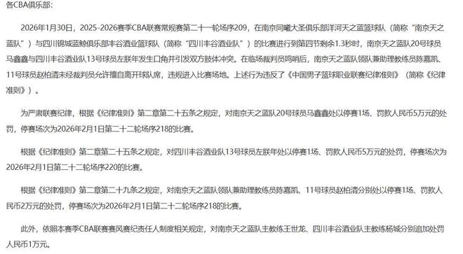 時(shí)隔1天后,北京時(shí)間2月1日,CBA聯(lián)賽針對(duì)這次沖突,開(kāi)出了本賽季至今為止最大的一張罰單,CBA公司以“馬鑫鑫與左朕年發(fā)生口角并引發(fā)雙方肢體沖突,在臨場(chǎng)裁判員鳴哨后,助教陳嘉凱、趙柏清未經(jīng)裁判員允許擅自離開(kāi)球隊(duì)席,違規(guī)進(jìn)入比賽場(chǎng)地”為由,分別對(duì)左朕年、馬鑫鑫、趙柏清以及同曦助教陳嘉凱處以重磅處罰。