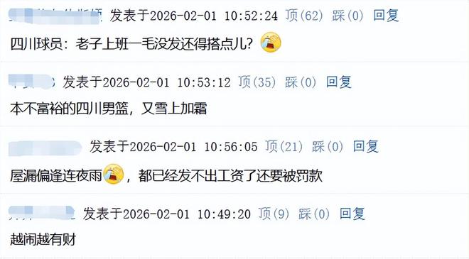 對(duì)于這張罰單,評(píng)論區(qū)球迷則是非常不理解,一部分球迷為四川隊(duì)叫屈:本不富裕的四川男籃,又雪上加霜;屋漏偏逢連夜雨,都已經(jīng)發(fā)不出工資了還要被罰款,至于嗎?還有球迷替左朕年喊冤:打了一年球,討薪違法,還欠5w!這下好了,上個(gè)班不但不掙錢,還得搭點(diǎn)。
