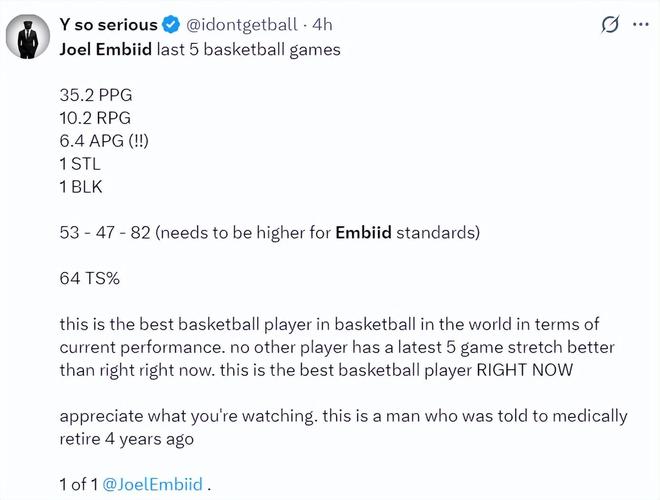 費城記者:就目前恩比德的表現(xiàn)而言,他還是這個世界上最出色的籃球運動員,沒有任何球員最近五場比賽的表現(xiàn)有他出色,他在最近四年頻繁遭遇傷病,這是他2024年以來首次常規(guī)賽出戰(zhàn)40場。