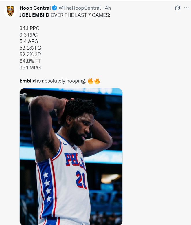 過去的7場比賽恩比德拿到6場30+,場均36.1分鐘,拿到34.1分9.3籃板5.4助攻,命中率53.3%,三分命中率52.2%,健康的恩比德的確就是聯(lián)盟第一檔。