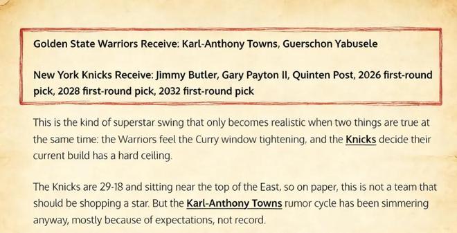 尼克斯擺脫唐斯,得到字母哥;勇士擺脫巴特勒,得到唐斯;而雄鹿吃下巴特勒的垃圾合同,從尼克斯和勇士手中同時拿到選秀權(quán)或年輕資產(chǎn),讓交易回報最大化。