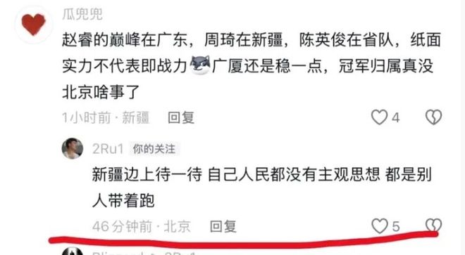 其實趙睿的意思不難理解,他主要是想說新疆球迷容易被帶節(jié)奏,但在說法上卻非常不妥,他用了“人民”兩個字,這已經(jīng)超出了籃球的范疇了,懂的都懂,這里就不多說了。目前有關(guān)趙睿的這次留言正在持續(xù)發(fā)酵,很多球迷都認為趙睿的這次發(fā)言非常不當(dāng)。特別是新疆球迷,對趙睿僅存的那點兒好感也沒有了,不少新疆球迷都打電話向相關(guān)球迷投訴。對于自己的這次發(fā)言,趙睿好像并沒有認識到不當(dāng)之處,反而進一步進行了回復(fù),表示自己不該就這么被人說。