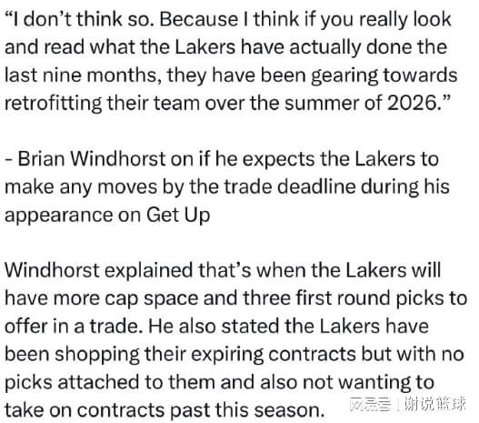 就連包括溫德霍斯特在內(nèi)的其他記者,也覺得湖人之所以不想留住詹姆斯,是因?yàn)榉艞壴谶@個(gè)賽季爭冠可能性。所以哪怕截止日前,湖人都不太可能做出有效補(bǔ)強(qiáng),湊合把這個(gè)賽季給熬完,等今年夏天詹姆斯合同到期,雙方分道揚(yáng)鑣以后,湖人可以騰出薪資空間。到時(shí)候管理層工作很多,比如需要給里夫斯開出新合同,八村塁、艾頓和斯瑪特等人,可能面臨續(xù)約事宜,詹姆斯的未來去向,同樣會(huì)成為焦點(diǎn)。
