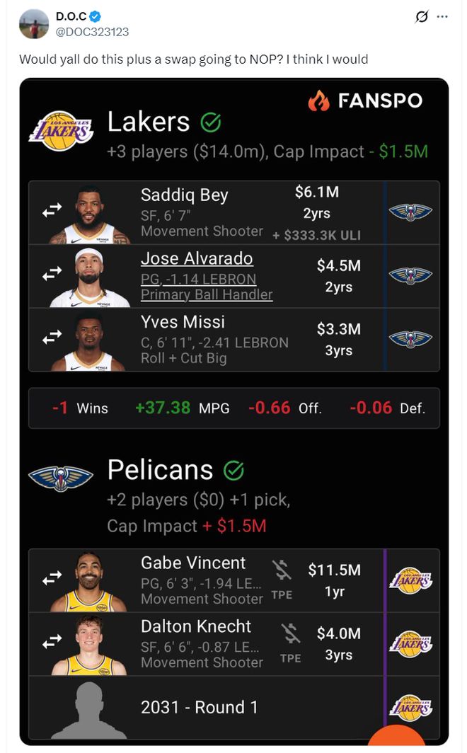 湖人媒體為佩林卡模擬了一套交易方案,湖人送出文森特、克內(nèi)克特、2031年首輪簽,得到薩迪克-貝、阿爾瓦拉多、伊夫-米西,這筆交易是3換3,湖人原本是14+3名單,這筆交易后正好就是15+3名單。