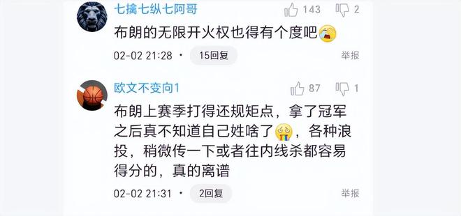 布朗是上賽季奪冠英雄,被評(píng)為總決賽MVP。但從此也飄了,飄得似乎不知自己姓什么了。球迷怒批道,“布朗上賽季打得還規(guī)矩點(diǎn),拿了冠軍之后真不知道自己姓啥了,各種浪投,稍微傳一下或者往內(nèi)線(xiàn)殺都容易得分的,真的離譜”、“布朗的無(wú)限開(kāi)火權(quán)也得有個(gè)度吧”。廣廈再任由布朗這么打,這賽季完了,最近幾場(chǎng)都沒(méi)什么配合,全是掄,都想當(dāng)大哥,心態(tài)完全不對(duì),太飄了。