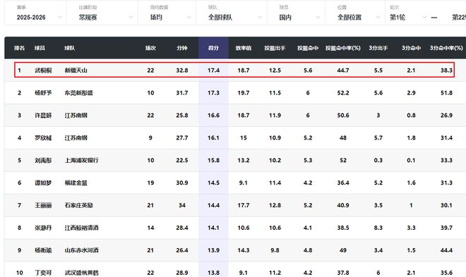在本賽季的本土球員得分榜上,武桐桐場均得到17.4分排名第一,楊舒予場均得到17.3分排名第二,許晨妍場均得到16.6分排名第三,羅欣棫16.1分第四,劉禹彤15.8分第五。