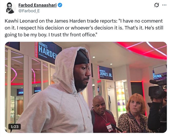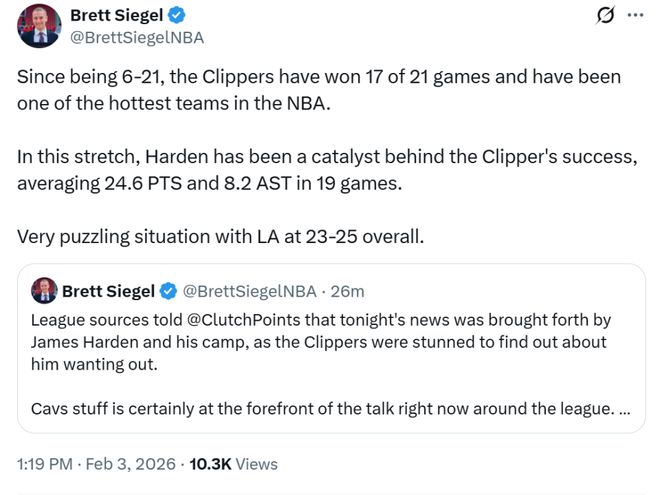 名記Siegel隨后發(fā)文確認是哈登與其團隊向球隊管理層提出交易申請,快船隊對此感到很震驚,但還是同意了。