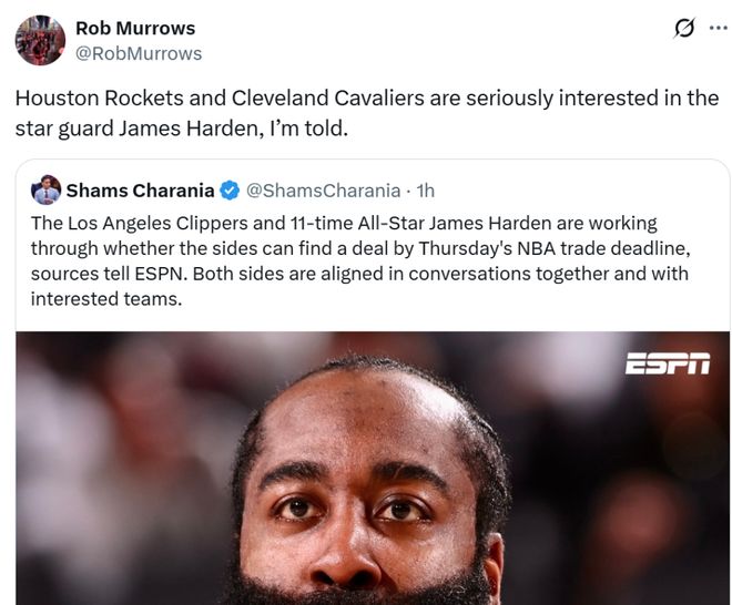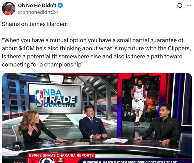 ESPN名記Shams隨后發(fā)文確認消息真實性,同時跟進表示哈登與快船雙方都在討論能否在交易截止日前離隊,并且雙方都在尋找感興趣的下家進行討論。