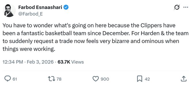 快船隊記Farbod Esnaashari第一時間發(fā)文吐槽并表示是哈登團隊提出交易申請,他寫道:“真好奇到底發(fā)生了什么,從去年12月份至今快船隊表現(xiàn)一直非常出色,結(jié)果哈登與其團隊突然提出交易申請,這讓人感到費解,也讓人感到有些不安,尤其是一切順利時?!?/p>