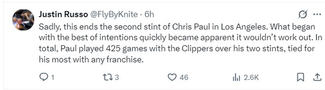 這筆交易發(fā)生后,快船記者Justin Russo寫道:保羅在快船的生涯就此終結(jié),令人遺憾。起初雙方都希望朝著理想的方向發(fā)展,但很快彰顯出矛盾無法延續(xù)下去。保羅職業(yè)生涯為快船出戰(zhàn)425場比賽,這一數(shù)字是他效力過的任何球隊(duì)中最高紀(jì)錄。