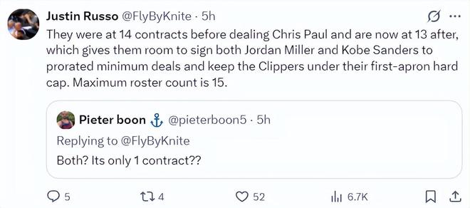 快船隊(duì)一直有意將桑德斯、喬丹米勒兩位雙向合同球員的合同轉(zhuǎn)為正式合同,送走保羅后大名單只剩下13人正好可以轉(zhuǎn)正這兩位出色的年輕小將。而且喬丹-米勒、科比-桑德斯兩人的合同會(huì)轉(zhuǎn)為最低的新秀合同,這樣快船可以保持在第一奢侈稅征點(diǎn)之內(nèi)。