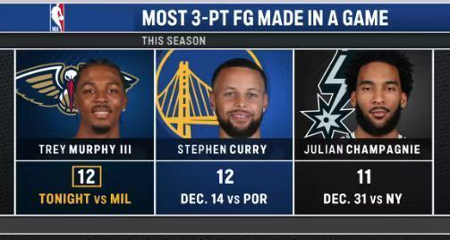 鵜鶘:墨菲12記三分44分6籃板6助攻3搶斷,三分命中數(shù)與得分均創(chuàng)生涯新高紀(jì)錄,追平庫(kù)里并列本賽季單場(chǎng)三分命中數(shù)聯(lián)盟第一。貝4記三分22分,錫安20分5籃板8助攻,費(fèi)爾斯13分。