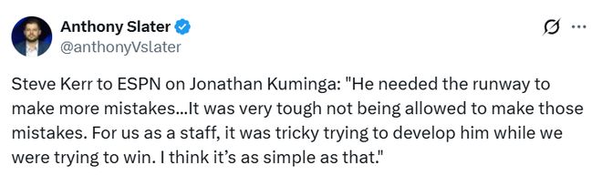 “我覺(jué)得對(duì)所有人來(lái)說(shuō),這都是一個(gè)艱難的處境,”科爾說(shuō)道,“他剛來(lái)時(shí)技術(shù)非常粗糙,而我們當(dāng)時(shí)仍在全力沖擊總冠軍。他需要足夠的空間去犯錯(cuò),需要在 NBA 賽場(chǎng)積累經(jīng)驗(yàn),去真正理解這個(gè)聯(lián)盟的內(nèi)涵。對(duì)他而言,不被允許犯錯(cuò)的滋味很難熬;對(duì)我們教練組來(lái)說(shuō),一邊要爭(zhēng)冠,一邊還要培養(yǎng)他,這也很棘手。事情就是這么簡(jiǎn)單?!?/p>