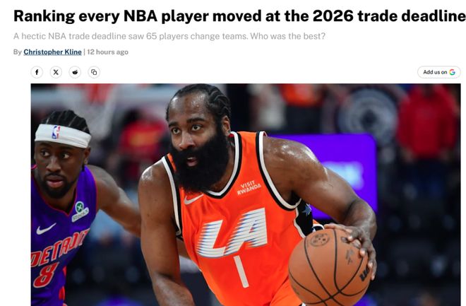 交易人數(shù)破NBA歷史紀(jì)錄!美媒排出截止日10大換隊球星,哈登與祖巴茨兩人攜手殺入前5名,火箭隊錯失數(shù)個理想目標(biāo)。
