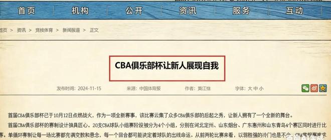 2024-25賽季,CBA開始創(chuàng)建俱樂部杯,旨在給本土年輕球員展現(xiàn)舞臺,為他們提供更多表現(xiàn)機會。為此,中國體育報甚至曾在國家體育總局官網(wǎng)上刊文《CBA俱樂部杯讓新人展現(xiàn)自我》,以彰其義。