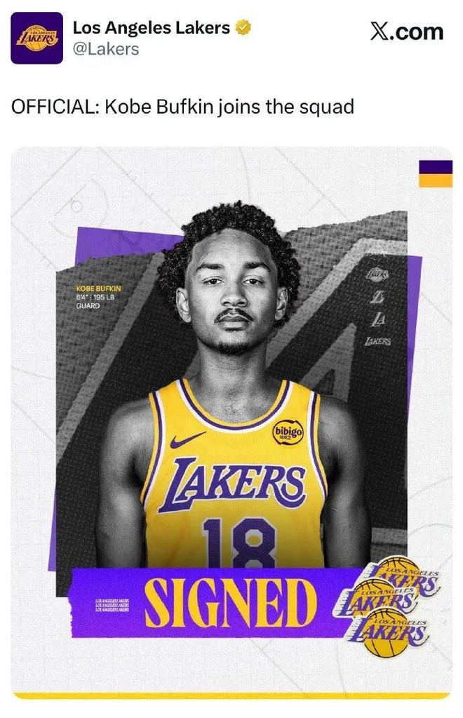 有球迷表示,湖人簽下 科比-巴夫金,大概就是因?yàn)樗拿纸锌票劝伞?/p>