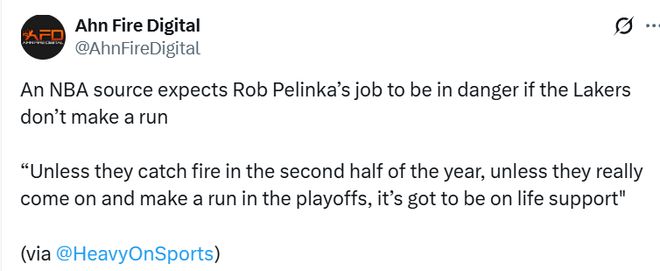 美媒Heavy報(bào)道稱,一位NBA消息源稱:“除非湖人下半程突然爆發(fā)、在季后賽打出一番成績(jī),否則佩林卡的位置岌岌可危,很難繼續(xù)留任。擁有詹姆斯和東契奇,今年還要打附加賽的話,已經(jīng)沒(méi)什么借口可找。佩林卡在聯(lián)盟里還有威信嗎?他有清晰的建隊(duì)藍(lán)圖嗎?這才是問(wèn)題所在。”