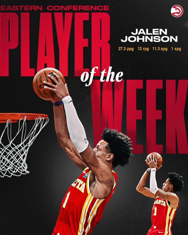過去一周,約翰遜場(chǎng)均27.3分12.0籃板11.3助攻,幫助老鷹打出2勝1負(fù)的戰(zhàn)績。