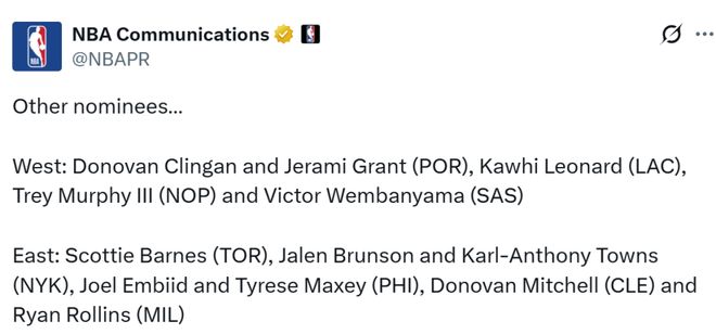 西部:克林根和格蘭特(開拓者)、萊昂納德(快船)、墨菲(鵜鶘)、文班亞馬(馬刺)