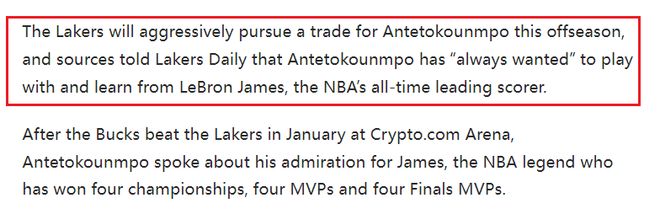北京時(shí)間2月10日,根據(jù)美媒LakersDaily的報(bào)道,湖人將在休賽期積極尋求交易得到揚(yáng)尼斯·阿德托昆博。消息人士告知,阿德托昆博一直渴望與NBA歷史得分王勒布朗·詹姆斯并肩作戰(zhàn)并向他學(xué)習(xí)。