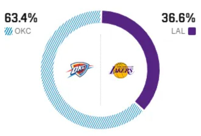 賽前,美媒ESPN對本場比賽進(jìn)行了勝率預(yù)測,湖人隊(duì)勝率僅有36.6% ,雷霆勝率則高達(dá)63.4% ,差距非常明顯。