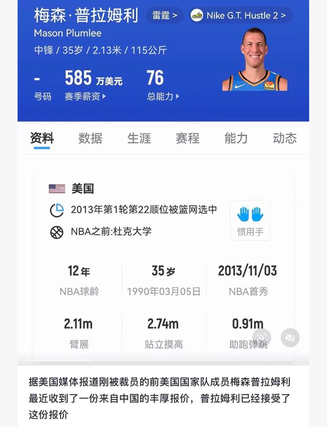 今年35歲的普拉姆利,曾是夢之隊(duì)的主力中鋒,他擁有非常高的籃球智商,擁有非常出色的策應(yīng)能力,擁有非常不錯(cuò)的防守能力,擁有非常不錯(cuò)的護(hù)框能力,當(dāng)然了,他還擁有非常不錯(cuò)的終結(jié)能力。