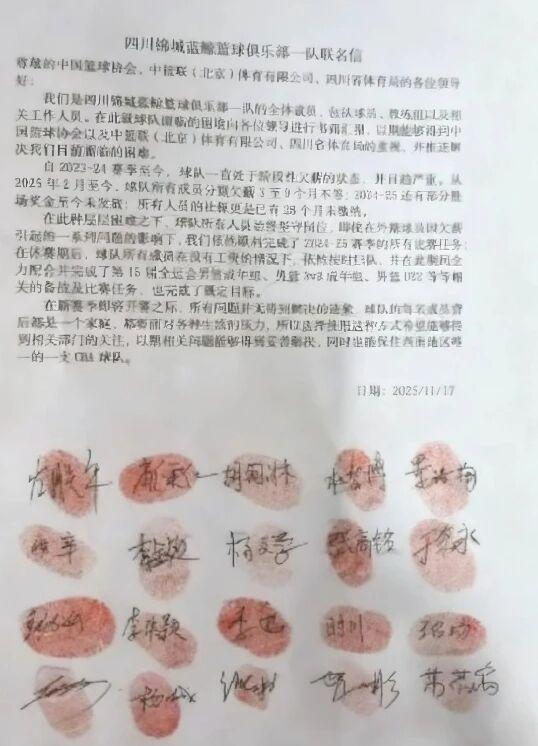 除了教練組已經(jīng)集體罷工外,國內(nèi)知名媒體直播吧也透露,四川男籃球員、教練、工作人員日前已經(jīng)向籃協(xié)、CBA公司、四川省體育局發(fā)布聯(lián)名信,請求解決四川男籃的欠薪問題。另外四川男籃上個(gè)賽季的外援馬里奇也在社交媒體上發(fā)聲,表示自己也存在被欠薪的問題。目前來看的話,四川男籃的情況已經(jīng)非常糟糕,很可能會無法出戰(zhàn)新賽季的CBA聯(lián)賽。