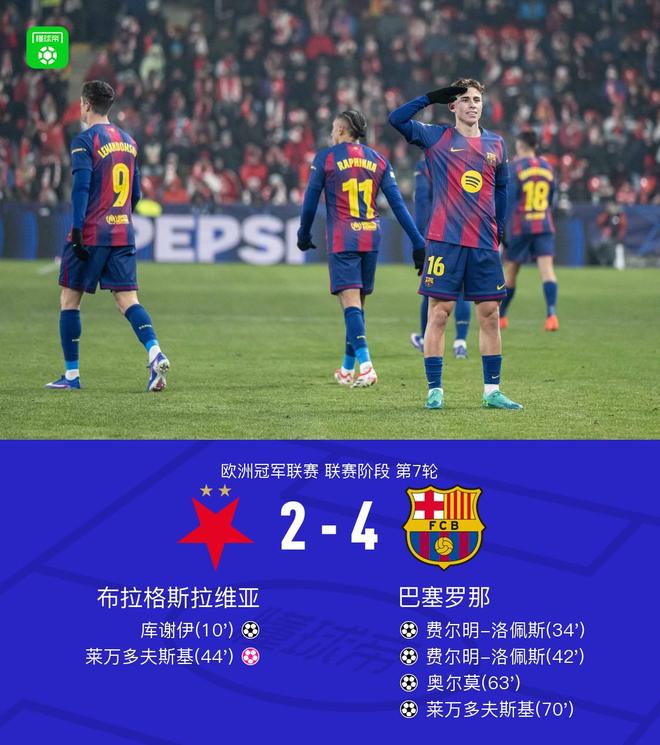 北京時(shí)間1月22日歐洲冠軍聯(lián)賽聯(lián)賽階段第7輪,布拉格斯拉維亞對(duì)陣巴塞羅那。上半場(chǎng)庫(kù)謝伊幸運(yùn)破門(mén),費(fèi)爾明梅開(kāi)二度,萊萬(wàn)解圍自擺烏龍,下半場(chǎng)奧爾莫世界波遠(yuǎn)射破門(mén),萊萬(wàn)禁區(qū)鉤射鎖定勝局。最終比分布拉格斯拉維亞 2-4 巴薩。