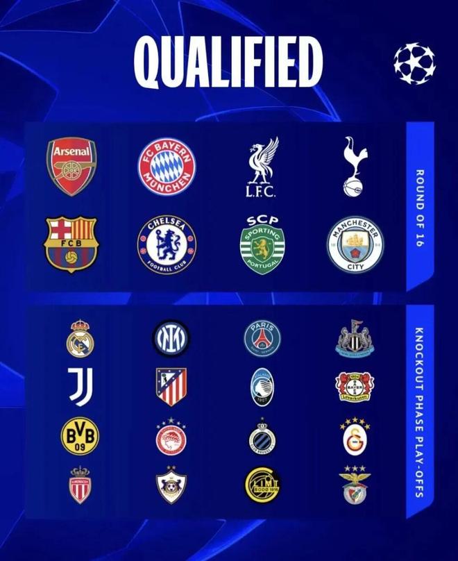 跌入淘汰賽附加賽的球隊(duì)則構(gòu)成了豪華陣容。其中,種子球隊(duì)(第9至16名)包括:皇家馬德里、國(guó)際米蘭、巴黎圣日耳曼、紐卡斯?fàn)柭?lián)、尤文圖斯、馬德里競(jìng)技、亞特蘭大、勒沃庫(kù)森。皇馬在末輪前高居第三,一場(chǎng)失利讓他們直接跌至第九,不得不為16強(qiáng)名額再戰(zhàn)一輪。