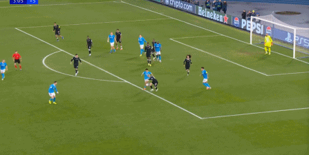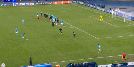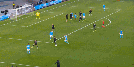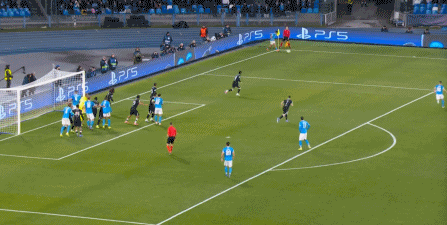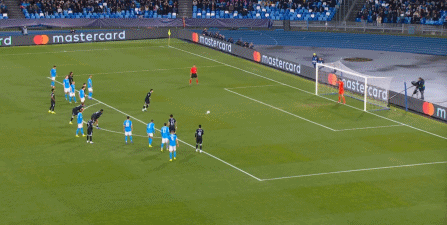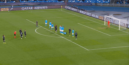 但在這次任意球的主罰過程中,那不勒斯送上了手球犯規(guī),于是任意球直接變成了點(diǎn)球: