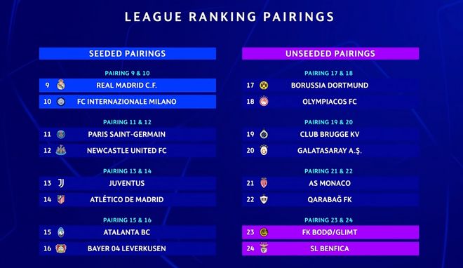 附加賽的對(duì)陣依據(jù)球隊(duì)在歐冠聯(lián)賽階段的最終排名來(lái)決定: