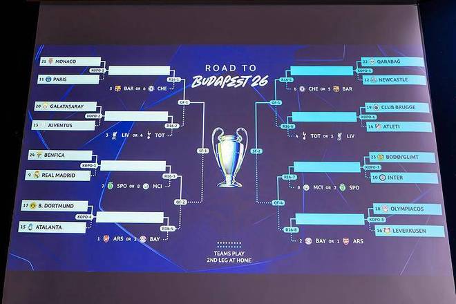 歐冠改制后,聯賽階段前8名直通16強,第9-24名進入附加賽,8支種子隊享有先客后主優(yōu)勢。附加賽焦點對陣中,皇馬迎戰(zhàn)本菲卡、巴黎遭遇摩納哥、國米對決博德閃耀,其余對決包括紐卡斯爾vs卡拉巴赫、尤文vs加拉塔薩雷、馬競vs布魯日、亞特蘭大vs多特蒙德、勒沃庫森vs奧林匹亞科斯。附加賽首回合2月17-18日進行,次回合2月24-25日打響,16強抽簽定于2月27日,決賽5月30日在布達佩斯上演。