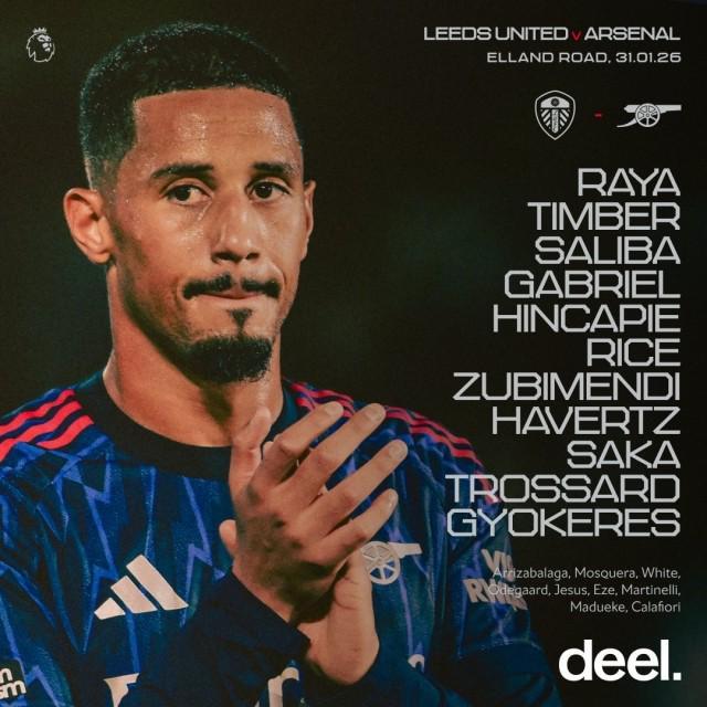 英超第24輪,阿森納客戰(zhàn)利茲聯(lián),賽前阿森納首發(fā)陣容出爐,具體名單如下: 阿森納首發(fā):拉亞 / 廷伯、薩利巴、加布里埃爾、因卡皮耶 / 賴斯、蘇維門迪、哈弗茨 / 薩卡、哲凱賴什、特羅薩爾