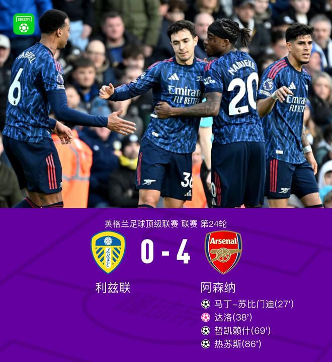 北京時(shí)間1月31日英超聯(lián)賽第24輪,利茲聯(lián)主場(chǎng)對(duì)陣阿森納。賽前薩卡熱身受傷,上半場(chǎng),首發(fā)登場(chǎng)的馬杜埃凱表現(xiàn)亮眼,他先是助攻蘇比門迪頭球破僵,隨后又通過(guò)角球造成達(dá)洛自擺烏龍。下半場(chǎng),替補(bǔ)登場(chǎng)的馬丁內(nèi)利助攻哲凱賴什擴(kuò)大領(lǐng)先,同樣替補(bǔ)登場(chǎng)的厄德高助攻熱蘇斯鎖定勝局。最終,阿森納客場(chǎng)4-0大勝利茲聯(lián),先賽一場(chǎng)7分領(lǐng)跑。