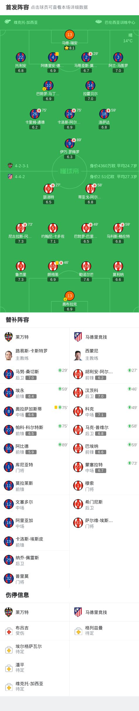 北京時間2月1日西班牙足球甲級聯(lián)賽 聯(lián)賽 第22輪,萊萬特主場對陣馬德里競技。上半場瑟洛特因頭部受傷被胡利安-阿爾瓦雷斯換下,尼古拉斯-岡薩雷斯搶點頭球攻門,皮球稍稍偏出。下半場尼古拉斯-岡薩雷斯外圍遠射被門將撲出,胡利安-阿爾瓦雷斯球門后點頭球攻門,皮球被門將撲出。全場戰(zhàn)罷,最終馬競在客場0-0戰(zhàn)平萊萬特。