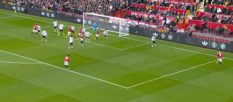 比賽剛剛開始不久,曼聯(lián)就創(chuàng)造出機(jī)會(huì)。阿馬德在右側(cè)內(nèi)切兜射遠(yuǎn)角,被撲了出去。第13分鐘,曼聯(lián)差一點(diǎn)丟球,幸好門將反應(yīng)極快,在門線伸手擋出了必進(jìn)球。5分鐘后,庫尼亞被放倒,裁判判罰點(diǎn)球,但隨后改判為任意球。布魯諾-費(fèi)爾南德斯主罰,他把球罰進(jìn)禁區(qū),卡塞米羅搶點(diǎn)頭球攻門,球進(jìn)了!曼聯(lián)取得領(lǐng)先。