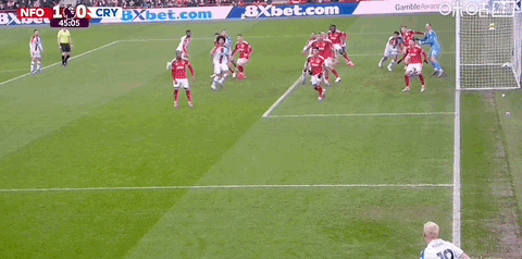 第2分鐘,水晶宮連續(xù)兩腳打門,均被森林后衛(wèi)和門將擋出