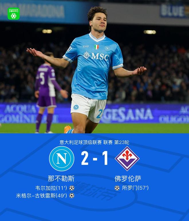 北京時間2月1日意大利足球頂級聯(lián)賽第23輪,那不勒斯主場對陣佛羅倫薩。上半場,韋爾加拉單刀冷靜破門。下半場,古鐵雷斯禁區(qū)內(nèi)兜射,擴大優(yōu)勢,隨后,所羅門門前補射進(jìn)球,扳回一城。最終比分那不勒斯 2-1 佛羅倫薩。