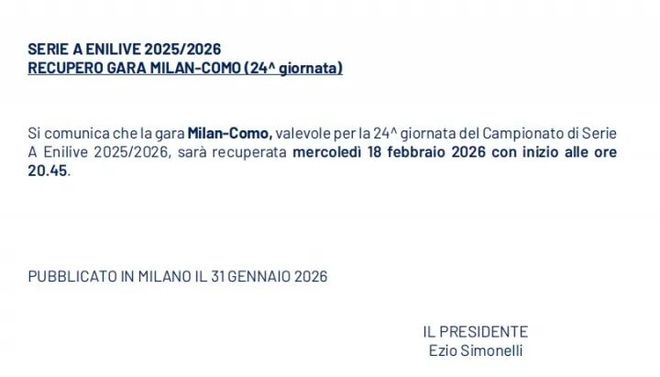 據(jù)意甲聯(lián)賽官網(wǎng)的消息,米蘭主場與科莫的補(bǔ)賽時(shí)間確定,將在北京時(shí)間2月19日03:45進(jìn)行。