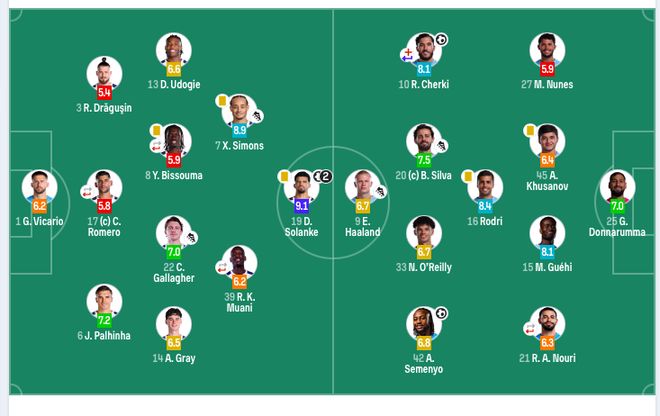 曼城首發(fā):25-多納魯馬、27-努內(nèi)斯、45-胡桑諾夫、15-格伊、21-艾特-努里(68’14-尼科·岡薩雷斯)、16-羅德里、20-B席(88’47-福登)、33-奧賴?yán)?2-塞梅尼奧、10-謝爾基(68’4-賴因德斯)、9-哈蘭德。