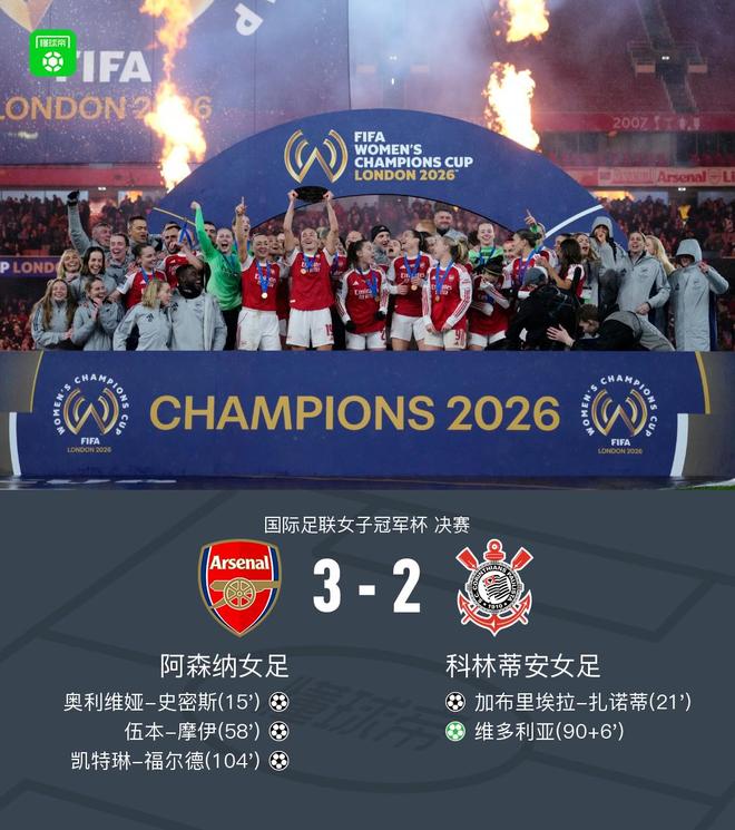 北京時(shí)間2月2日國(guó)際足聯(lián)女子冠軍杯 決賽,阿森納女足對(duì)陣科林蒂安女足。阿森納女足奧利維婭-史密斯破門,伍本-摩伊破門,凱特琳-福爾德破門。科林蒂安女足加布里埃拉-扎諾蒂破門,維多利亞破門。最終阿森納女足3-2科林蒂安女足奪得國(guó)際足聯(lián)女子冠軍杯冠軍。