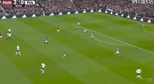 第19分鐘,B費助攻,卡塞米羅后點泰山壓頂頭槌破門,曼聯(lián)1比0富勒姆!