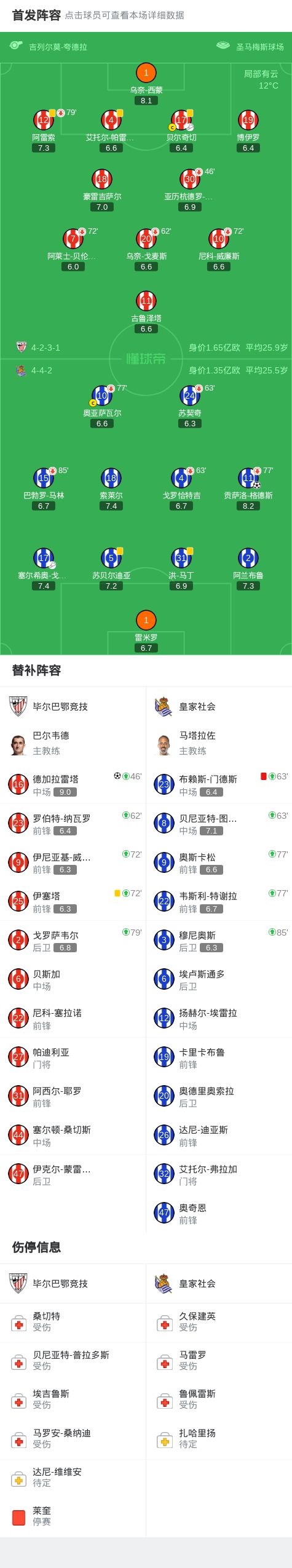 北京時間2月2日西班牙足球甲級聯(lián)賽 聯(lián)賽 第22輪,畢爾巴鄂競技主場對陣皇家社會。畢爾巴鄂競技德加拉雷塔破門。皇家社會貢薩洛-格德斯破門。最終比分畢爾巴鄂競技 1-1 皇家社會。