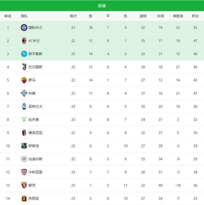 國際米蘭55分穩(wěn)居榜首,領(lǐng)先優(yōu)勢擴大到8分;尤文45分位列第一集團(tuán);那不勒斯排名第3,但已落后國米9分,追趕難度不小。
