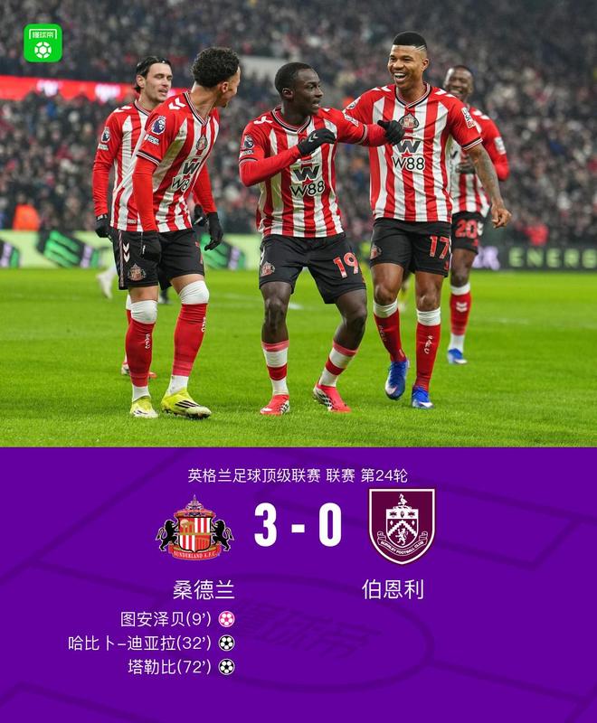 北京時(shí)間2月3日英格蘭足球頂級(jí)聯(lián)賽 聯(lián)賽 第24輪,桑德蘭主場(chǎng)對(duì)陣伯恩利。桑德蘭哈比卜-迪亞拉破門(mén),塔勒比破門(mén)。伯恩利圖安澤貝自擺烏龍。最終比分桑德蘭 3-0 伯恩利。