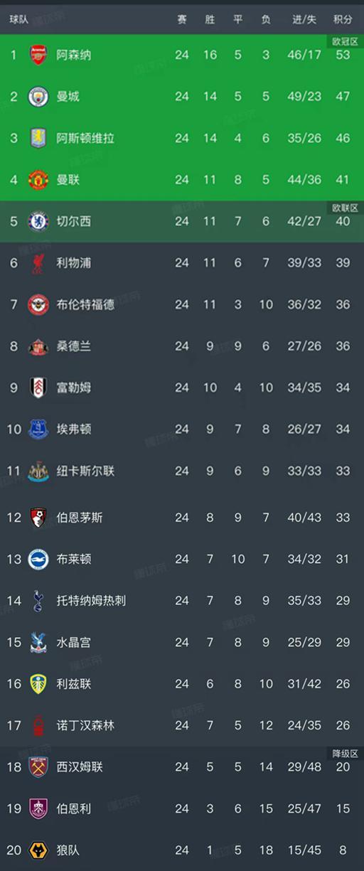 切爾西以40分暫列第5名,利物浦以39分暫列第6名,他們都還有很大的機會沖擊前四,目前最大的競爭對手就是第4的紅魔,藍軍落后紅魔1分,紅軍落后紅魔2分。布倫特福德、桑德蘭、富勒姆、埃弗頓、紐卡斯爾聯(lián)、伯恩茅斯和布萊頓的積分都在30分以上,暫列第7-第13名。西漢姆聯(lián)20分,伯恩利15分和狼隊8分處于降級區(qū),排在最后三名。